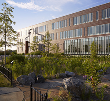 The 17.3 acre site provides athletic facilities, points of interest and education, and outdoor seating opportunities. New site landscaping was designed to complement the modern architecture and enhance a campus-like, pedestrian oriented environment.  It connects the site elements to the school and the neighborhood at large. The exterior sport facilities include a baseball field, softball field, running track, tennis courts, and combination soccer and football field.  The site features accessible, multi-functional space including a biology garden, diverse native plantings, community gardens, outdoor classroom/picnic area, built bleachers and custom concrete sport seating, council ring, rain gardens, a cistern, geothermal field, and native plant education signs.
