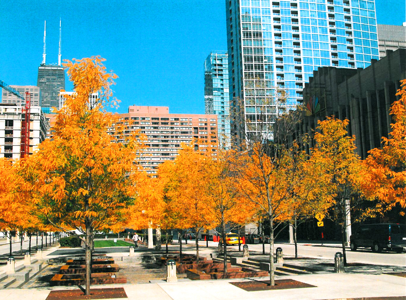 NBC Plaza was part of the on-structure Cityfront Center project along the north bank of the Chicago River, home to the local NBC Station. The Gleacher Center also anchors the plaza space with pedestrian links to Michigan Avenue and the Chicago Riverfront. The original plaza had deteriorated badly since originally built. Over time, 45 trees died and were replaced three times. Major problems were poor selection of varieties and failing planter drainage. The tree pits were covered with heavy concrete slabs limiting access, so replacement trees drowned as soon as they were planted. The original irrigation system failed and was never replaced. |